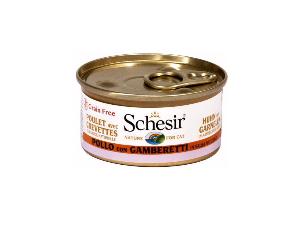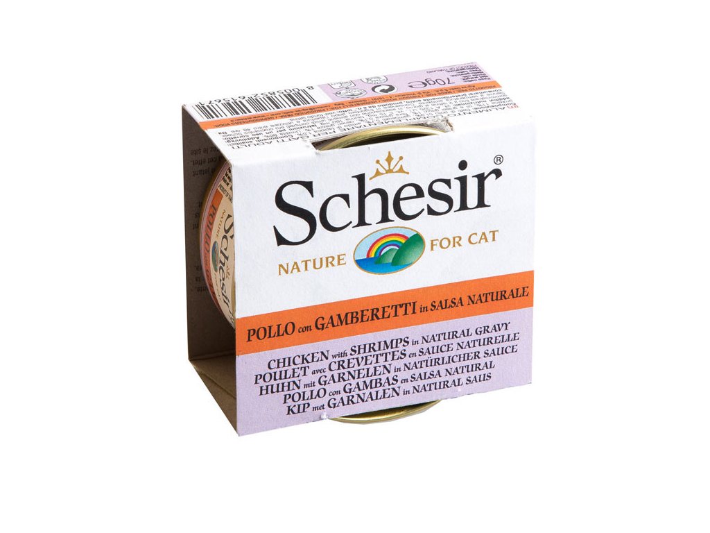 Schesir - kuřecí s krevetami v omáčce je špičková kvalita pro dospělé kočky se 100% přírodními přísadami, dušené v páře v přírodní omáčce. Bez přidaných barviv a konzervačních látek, s tapiokovým škrobem pro obohacení chuti všech dospělých koček.