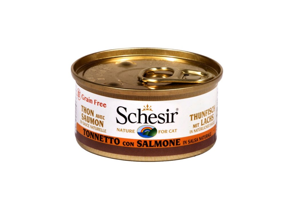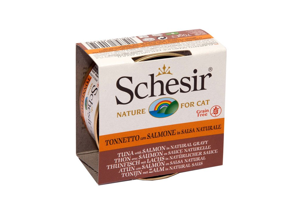 Schesir - tuňák a losos v omáčce je špičková kvalita pro dospělé kočky se 100% přírodními přísadami, dušené v páře v přírodní omáčce. Bez přidaných barviv a konzervačních látek, s tapiokovým škrobem pro obohacení chuti všech dospělých koček.