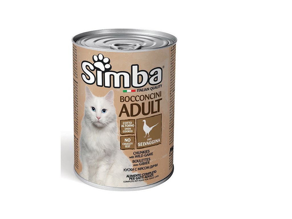 Simba Cat je kompletní krmivo v konzervě pro dospělé kočky. Kousky masa v omáčce jsou před vložením do omáčky pečené tak, aby se podpořila chuť masa a stimuloval apetit vašeho zvířete. Receptura byla doplněna o specifickou kombinaci vitamínů A-D3-E pro zajištění výživových potřeb zvířete. Bez přidaných barviv a konzervantů.Složení: Maso a živočišné deriváty (z toho zvěřina min. 6%), obiloviny, vejce a vaječné produkty, minerální látky.