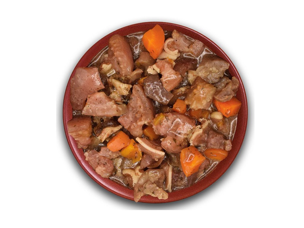 Naše receptura založená na světově známém pokrmu guláš, obsahuje jen čerstvé vepřové uši a maso doplněné o zeleninu a funkční koření. Toto krmivo můžete bezpečně ochutnat a ujistit se, že dáváte psovi jen to nejlepší, co nám příroda nabízí. Uši s masem a zelenina se vaří při nízké teplotě, čímž zachovají svou šťávu a všechny nutriční hodnoty v jedné misce.