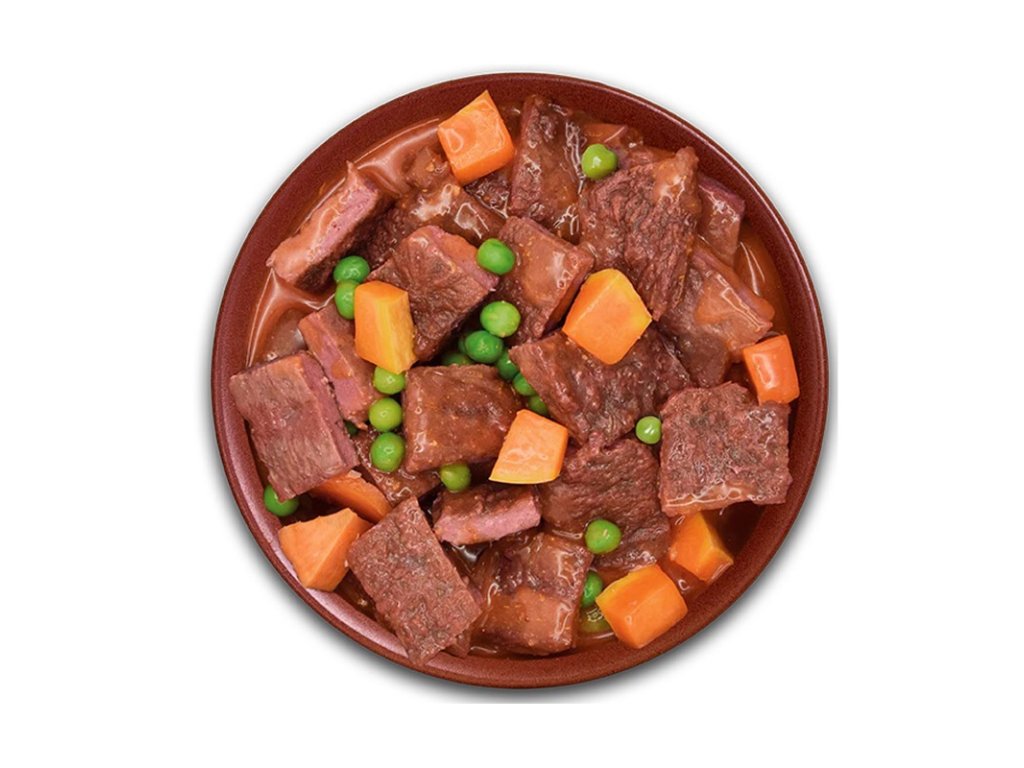 Složení: 97% čerstvé hovězí maso z kýty v omáčce z vlastní šťávy, sladké brambory, hrášek, mrkev, koření