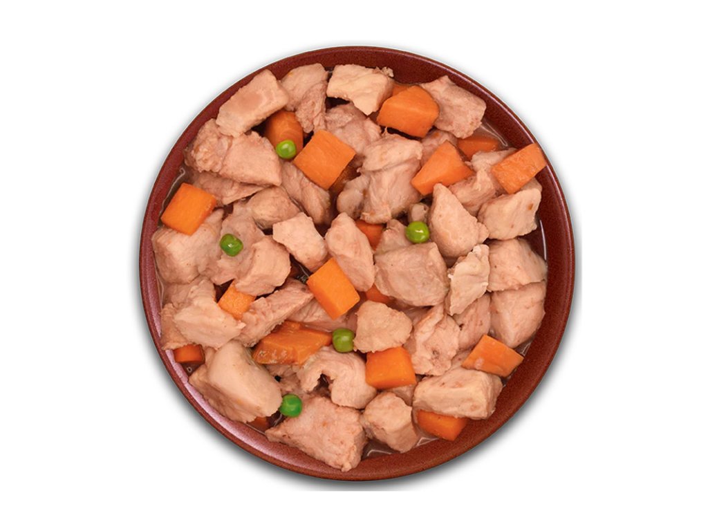 Složení: 97% čerstvé vepřové maso z kýty v omáčce z vlastní šťávy, hrášek, mrkev, sladké brambory, koření