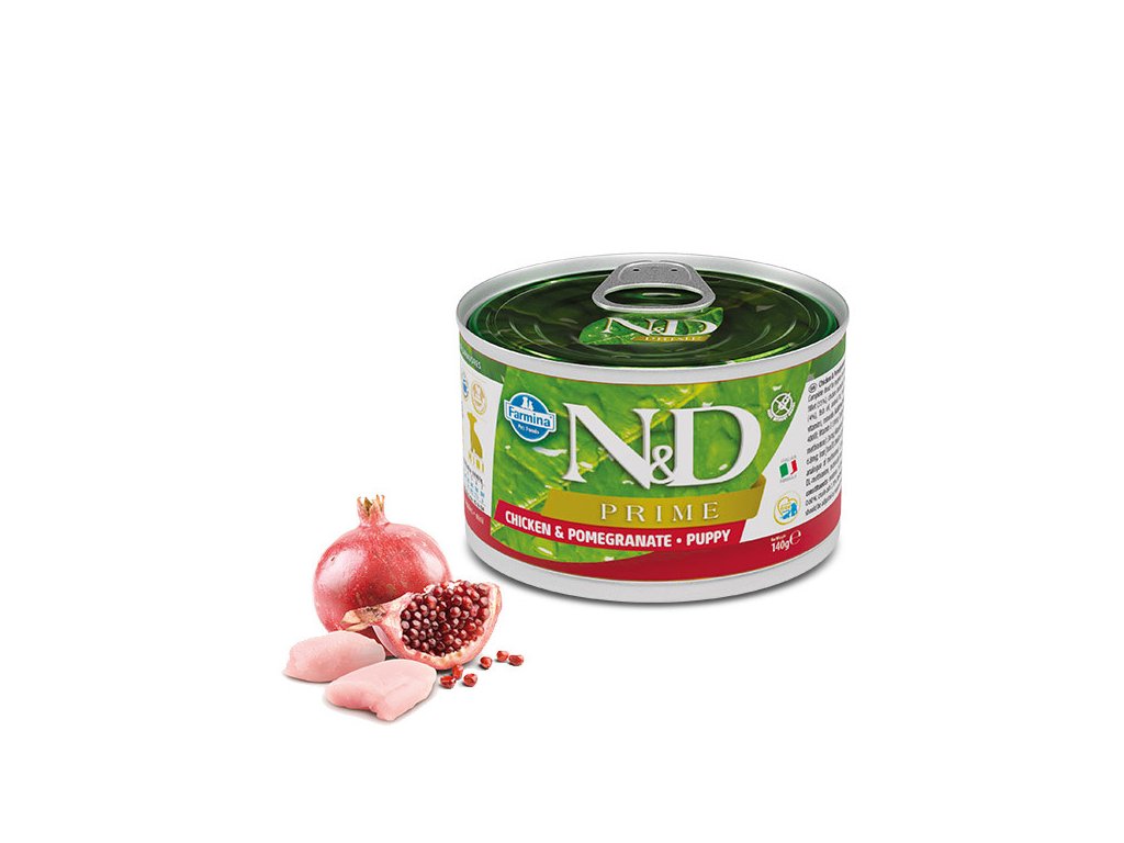 Farmina N&D Prime Dog Puppy Mini Chicken &Pomegranate konzerva s obsahem kuřecího masa a granátového jablka určená pro štěňata malých plemen a kojící feny.