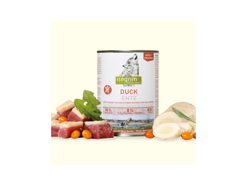Isegrim Dog Adult Duck + Parsnip, Sea Buckthorn Berries &Wild Herbs je konzerva plná chuti. Kachní maso, pastinák, vitamín C obsažený v bobulích rakytníku z něj dělá plnohodnotné jídlo pro vašeho psa. K plnohodnotné stravě přispívá také mix minerálních látek a bylinek. S nízkým obsahem tuku je vhodný i pro starší psy a psy po kastraci.