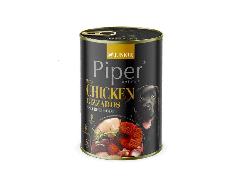 Piper Dog Junior - kuřecí žaludky je kompletní krmivo pro štěňata psů všech plemen do dovršení 1. roku života. Složení krmiva bylo sestaveno tak, aby byla zajištěna přítomnost vysoce kvalitních živin, které zaručují správné fungování všech metabolických procesů. Obsah bílkovin a potřebných aminokyselin vyhovuje štěňatům během období jejich růstu. S obsahem omega-3 a omega-6 nenasycených mastných kyselin na podporu imunitního systému a zabránění tvorbě zánětů. Zároveň má pozitivní vliv na kvalitu srsti vašeho štěněte.