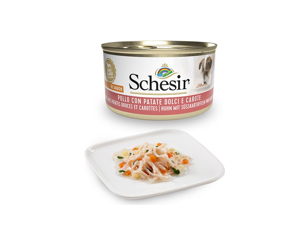 Schesir Dog Adult Petit Cousine Kuřecí filety, batáty a mrkev představuje recepturu založenou na chutném kuřecím mase připraveném v chutné omáčce určenou pro malá plemena psů, která milují přirozenou chuť a texturu masa.
