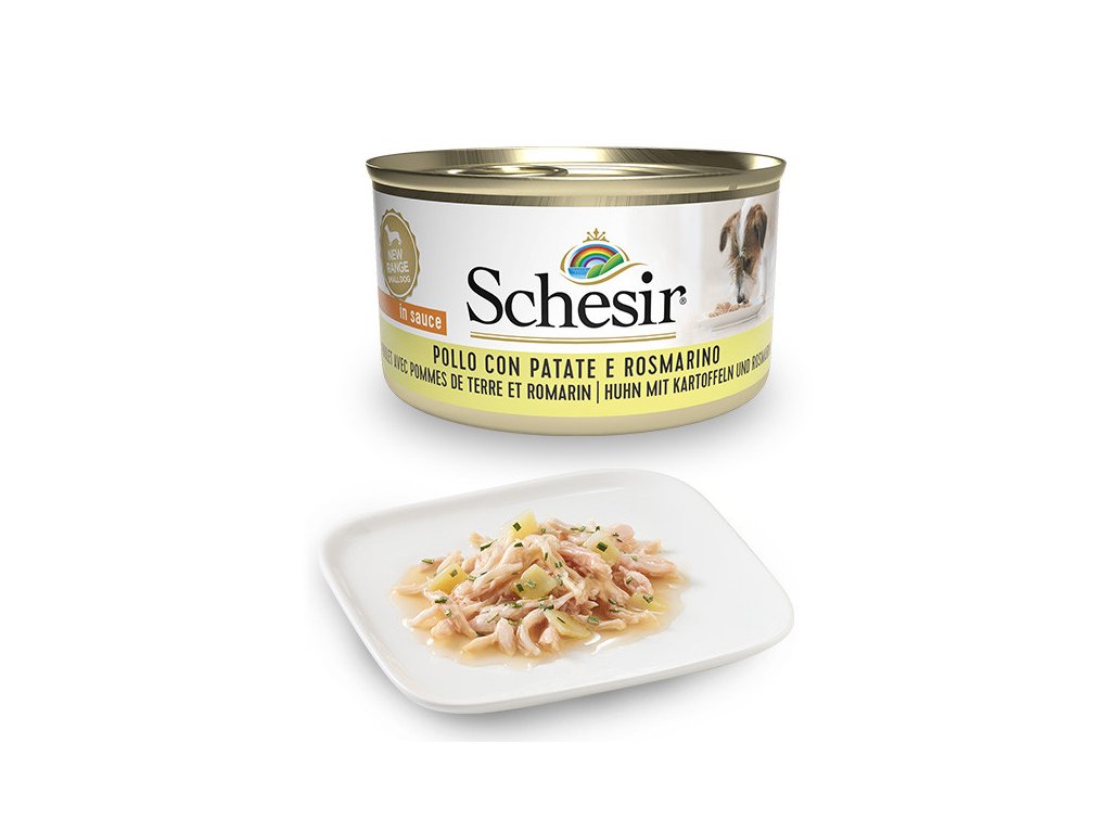 Schesir Dog Adult Petit Cousine Kuřecí filety se brambory a rozmarýnem představuje recepturu založenou na chutném kuřecím masu připraveném v chutné omáčce určenou pro malá plemena psů, která milují přirozenou chuť a texturu masa. Doplňeno o vařené brambory bez škrobu a rozmarýn.