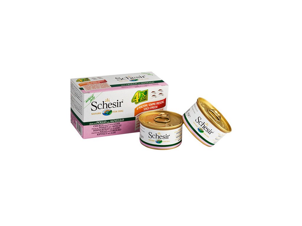 Schesir Dog Multipack - kuřecí s jehněčím je kompletní krmivo pro dospělé psy z kuřecích a jehněčích filetů vyrobené ručně oddělením svaloviny od kostí. Podle receptury je Schesir vyráběný pouze z kuřecího a jehněčího masa z kontrolovaných farem. Maso je vařené v páře s použitím pouze nejlepších částí po důkladném očištění. Tento proces zajišťuje vysokou přírodní nutriční hodnotu, vysokou stravitelnost a chutnost. Jen maso té nejlepší kvality najdete v konzervě Schesir: potraviny bez konzervačních látek, barviv, živočišných a rostlinných derivátů.