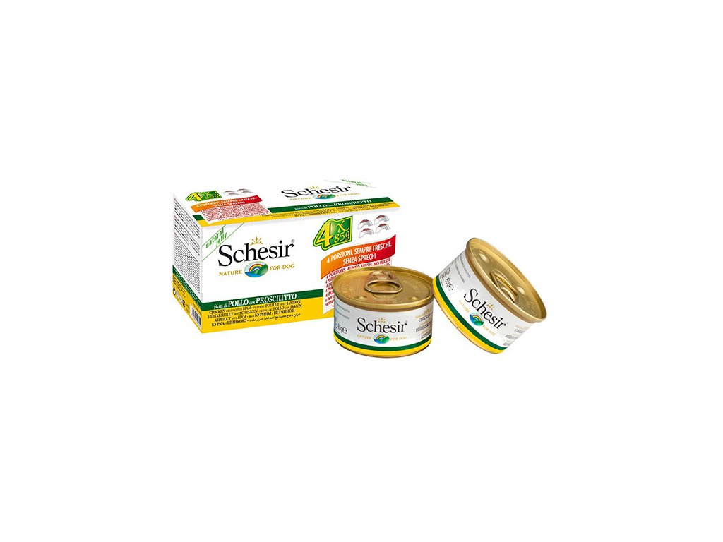 Schesir Dog Multipack - kuřecí se šunkou je kompletní krmivo pro dospělé psy z kuřecích filet a šunky vyrobené ručně oddělením masového svalstva od kostí. Podle receptur je pouze Schesir vyroben z kuřecího a šunky z kontrolovaných farem. Maso je vařené v páře s použitím pouze nejlepších částí po důkladném vyčištění. Tento proces zajišťuje vysokou přírodní nutriční hodnotu, vysokou stravitelnost a chutnost. Pouze maso té nejlepší kvality najdete v konzervě Schesir: potravina bez konzervačních látek, barviv, živočišných a rostlinných derivátů.