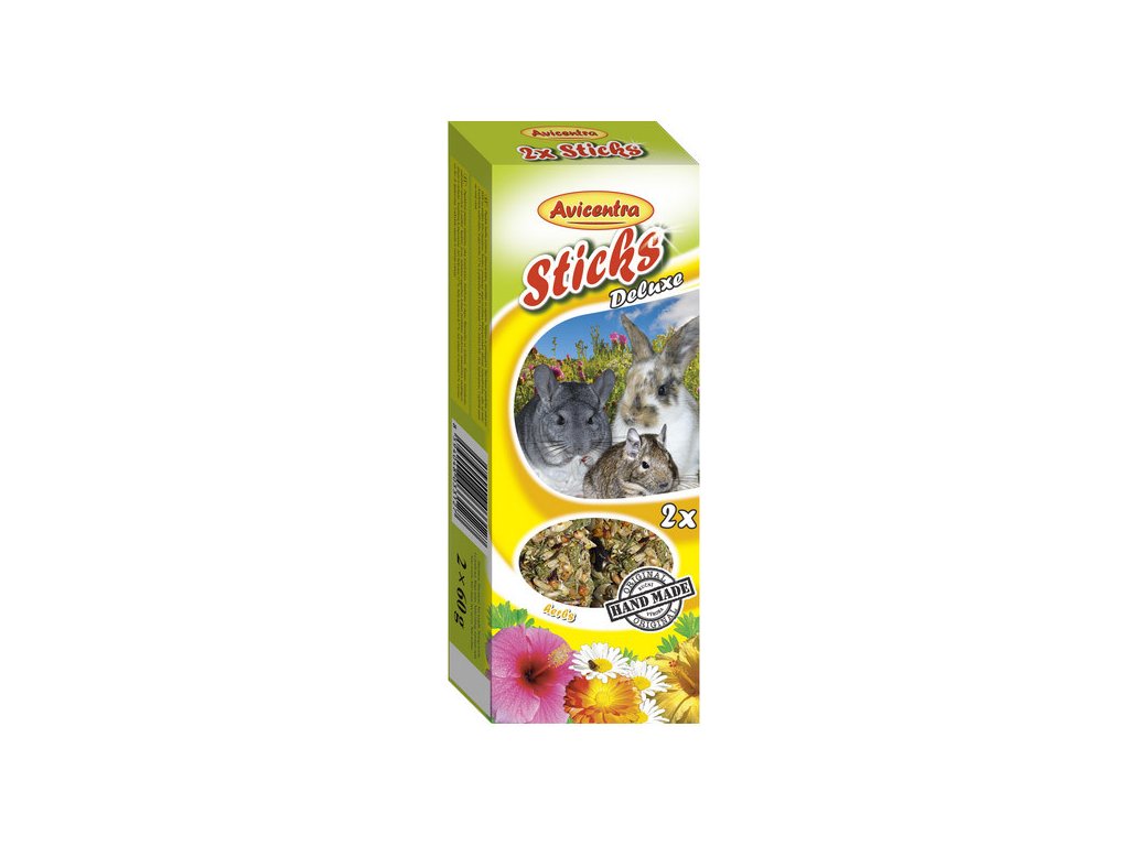 Avicentra tyčinky Deluxe s bylinkami jsou doplňkové krmivo pro králíky, morčata a jiné hlodavce. Tyčinky s bylinkami jsou skvělou pochoutkou, ale i krmivem, které vašemu domácímu mazlíčkovi dodává důležité vitamíny a minerály pro zdravý a vitální život. Tyčinky jsou speciálním krmivem, při kterém se váš domácí mazlíček musí snažit získat potravu podobnou jeho přirozenému prostředí. To pomáhá jeho fyzické i psychické kondici.