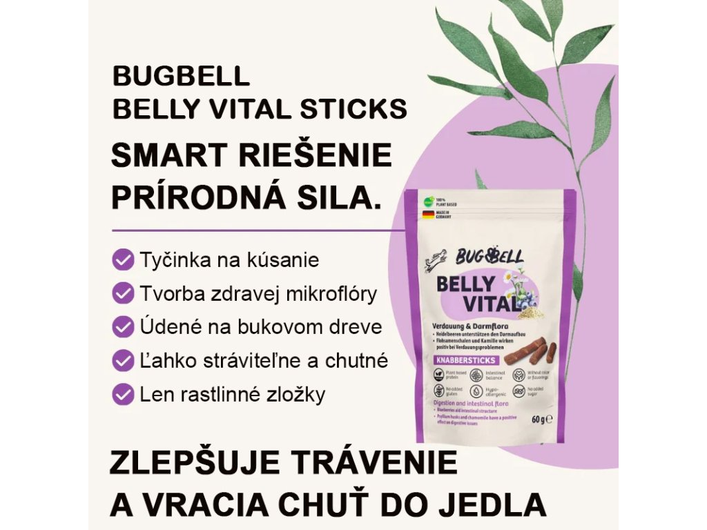 Animonda BugBell Soft Dog Treat - Belly Vital Sticks naše měkké tyčinky na podporu zdravé mikroflóry jsou funkční odměnou pro citlivé psí žaludky. Tyčinky jsou uzené na bukovém dřevě, díky čemuž je vnitřek funkční a křupavý a jejich vůně je neodolatelná. Mají nízký obsah tuku, snížený obsah bílkovin a dají se snadno rozdělit na malé kousky – ideální pro psy, kteří vyžadují šetrnou stravu, například pro psy s citlivou slinivkou nebo se sníženou funkcí ledvin. Receptura s borůvkami, psylliem a heřmánkem poskytuje cennou vlákninu a fytochemikálie, které pomáhají podporovat zdravé trávení. Ideální pro psy s citlivým trávením nebo pro každodenní podporu zdraví střev.