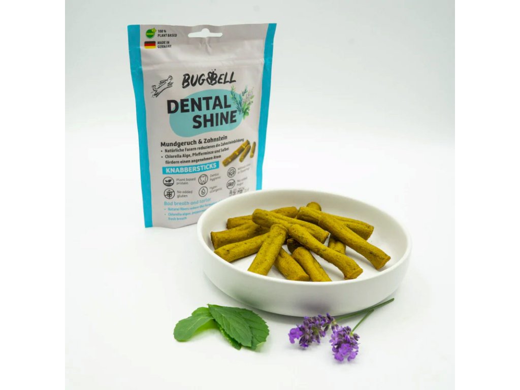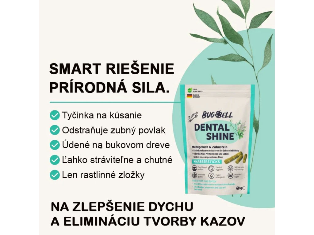 Animonda BugBell Soft Dog Treat - Dental Shine Sticks naše měkké zubní tyčinky, které jsou šetrnou alternativou k tradiční péči o zuby. Tyčinky jsou uzené na bukovém dřevě, díky čemu je jejich vnitřek funkční, křupavý a svou vůní neodolatelné. Mají nízký obsah tuku a bílkovin a dají se snadno rozdělit na malé kousky – ideální pro psy, kteří vyžadují speciální stravu, například pro psy s citlivou slinivkou nebo sníženou funkcí ledvin. Kombinace rostlinné vlákniny, řas chlorella, šalvěje a máty peprné podporuje každodenní ústní hygienu a přirozeně napomáhá redukci zubního plaku a zlepšení dechu.