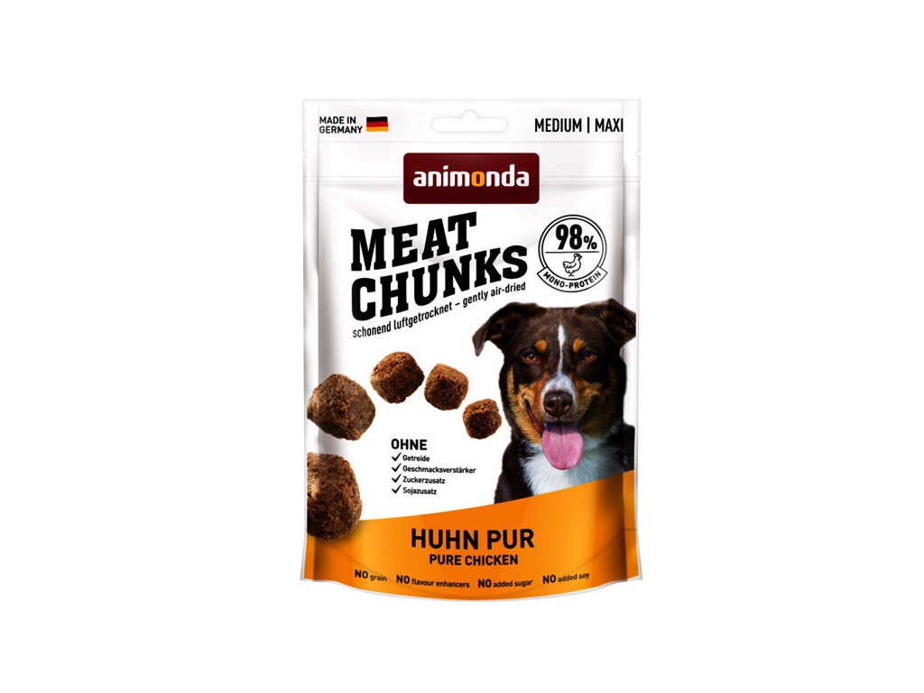 Animonda Dog Meat Chunks Medium&Maxi - kuřecí maso jsou chutné kousky masa pro psy středních a velkých plemen. Monoproteinové složení s jediným druhem masa: kuřecí bez obsahu obilovin, cukru, sóji či škrobu. Pamlsek pro všechny poslušné psy vhodný i k použití během tréninku. Sušené vzduchem.