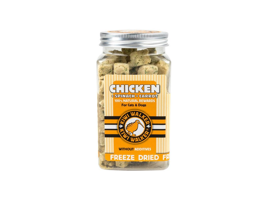 Mrazem sušené kuřecí se špenátem a mrkví od společnosti KiwiWalker jsou nejzdravějším lyofilizovaným pamlskem pro vašeho psa malého nebo středního plemene nebo pro kočku, vhodné v každé fázi života. Maso obohacené o zdravou zeleninu představuje kombinaci kvalitních bílkovin a potřebných vitamínů. Suroviny neobsahují přidaná barviva, konzervační látky ani jiné přídavné látky.