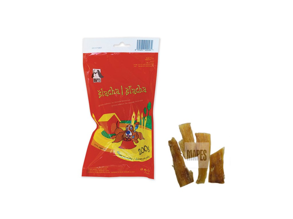 Mapes hovězí šlacha sušená jedinečným způsobem, který jim dodává specifický tvar, vůni a chuť vhodnou pro psy všech plemen. Takovému pamlsku váš pes neodolá. Šlachy jsou zbaveny viditelného tuku. Jsou velmi tvrdé a tak dlouho odolávají i těm nejsilnějším zubům. Výborné pro zábavu vašeho psa během vaší nepřítomnosti.Složení: 100% hovězí šíjová šlacha