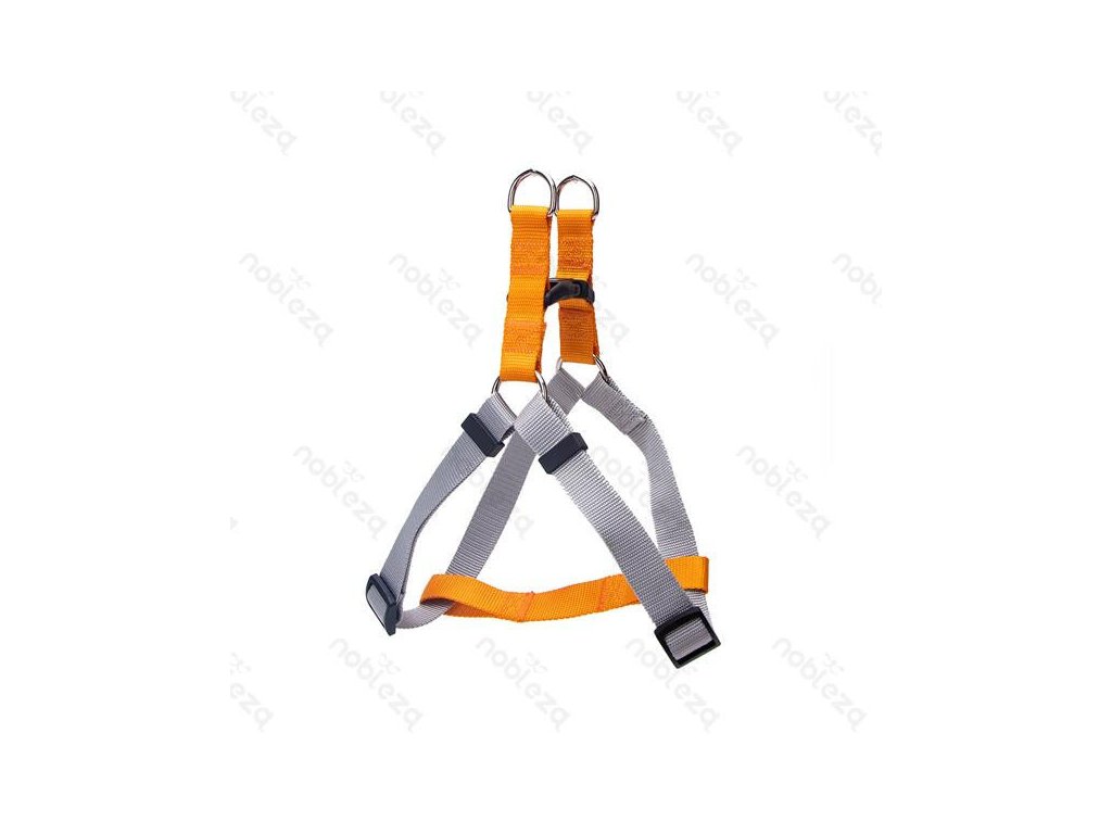 Postroj Nobleza dvoubarevný S (š. 1,5 cm x d. 30-50 cm) - určený pro štěňata a psy malých plemen. Vyrobený z kvalitní bavlny doplněné polyesterem. Vybavený kovovou sponou pro uchycení vodítka.