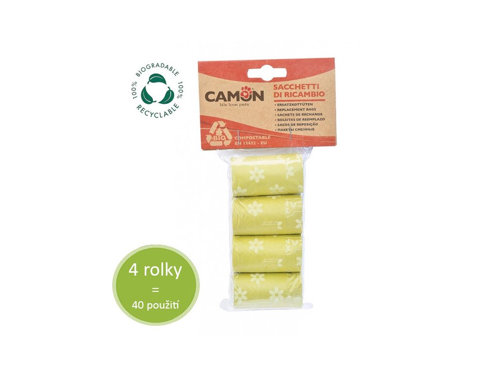 Bio rozložitelné sáčky na exkrementy Camon 4 role - vyrobené z kukuřičného škrobu, který je plně kompostovatelný. Vhodné pro použití do většiny zásobníků. Na rozdíl od jiných sáčků na exkrementy jsou sáčky Camon ekologické a přirozeně biologicky rozložitelné, splňují normu EN13432-EU.