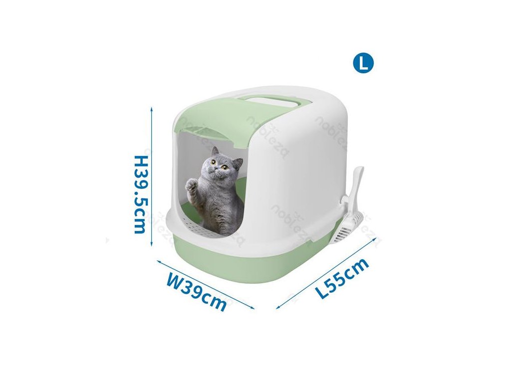 Uzavřená toaleta pro kočky Nobleza kombinuje moderní design s velkým vnitřním prostorem. Výměna steliva díky velkým otevíracím dvířkům je snadná i bez otevírání celé toalety. Na boku toalety se nachází místo na lopatku, která je součástí balení. V horní části je rukojeť pro přenášení toalety, úložný prostor a místo pro aktivní uhlíkový filtr.