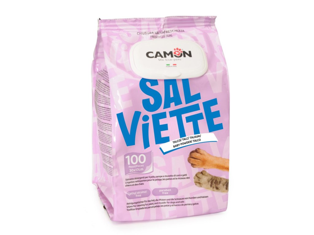 Vlhčené ubrousky pro zvířata Camon s vůní dětského pudru 100ks jsou praktický pomocník pro rychlé čištění a provonění srsti, tlapek a okolí uší a očí psů a koček. Balení s uzavíratelným plastovým víčkem zajistí, že se vlhčené ubrousky nevysuší.